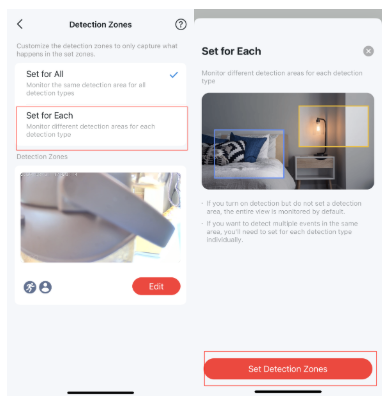 Étape 3 : appuyez sur Définir pour chacun et appuyez sur le bouton Définir les zones de détection dans l’image qui apparaît pour définir les zones de détection afin de capturer uniquement ce qui se passe dans les zones définies.