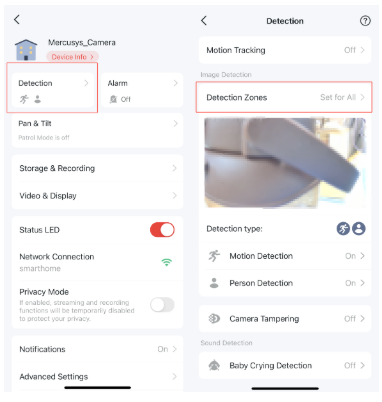 Étape 2 : appuyez sur Paramètres de l’appareil > Détection > Zones de détection .
